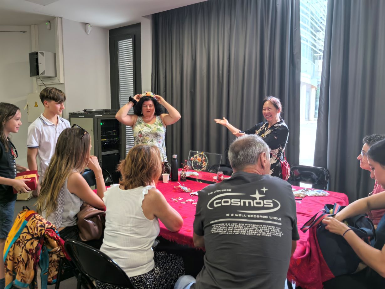De nombreux visiteurs de tout âge, qu’ils soient venus s’informer sur nos cours ou participer aux activités, ont répondu présents pour profiter d’un programme riche et festif : découverte et essayage du Hanfu, ateliers variés (calligraphie et peinture, fabrication de bijoux chinois, découpage de papier, fabrication de lanternes), dégustation de thé, jeux traditionnels comme le mah-jong, et bien d’autres activités interactives. Plus de vingt costumes traditionnels chinois étaient proposés à l’essai, et les participants se sont montrés très enthousiastes.